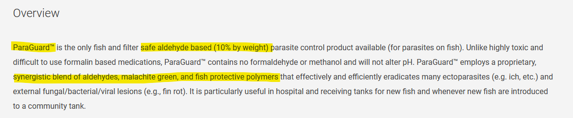 제조사에 의하면 말라카이트 그린, 알데하이드(포르말린은 아님)의 조합이다.