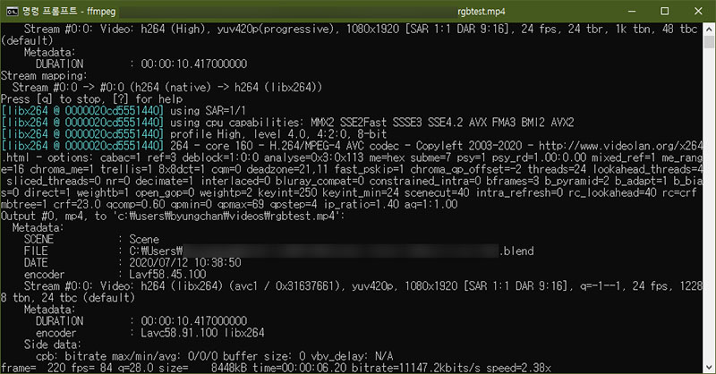 2. ffmpeg로 적당히 h264로 mp4로 인코딩한다.