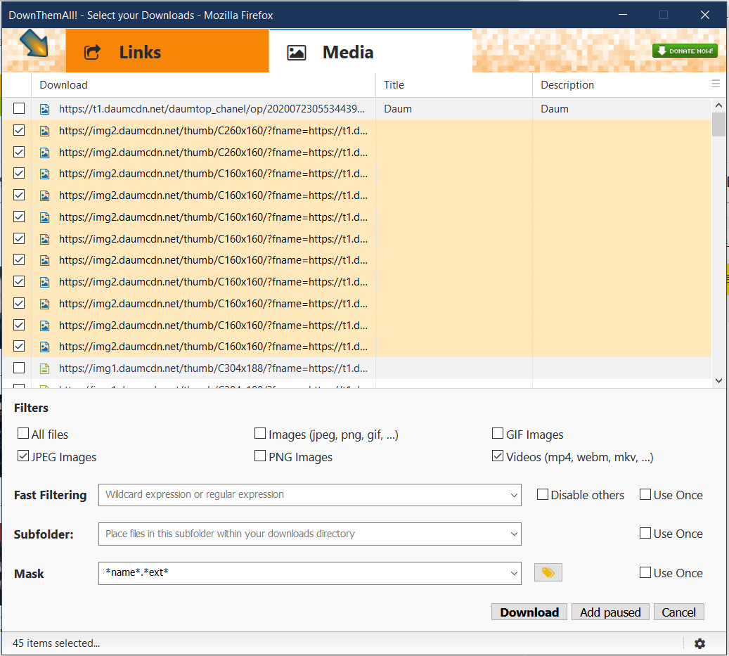 DownThemAll!버튼을 클릭하면 아래 그림처럼 Links와 Media로 구분되고