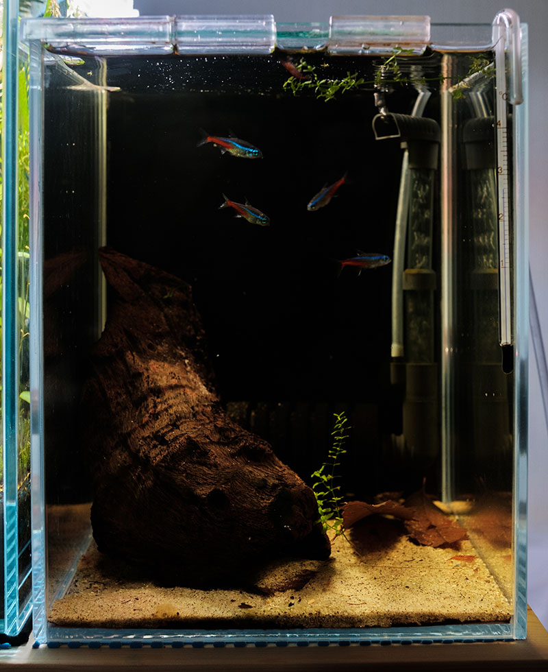 네온테트라항은 부상수초 전멸. 다섯마리인데 한 마리는 내가 쳐다볼 땐 계속 유목 뒤에 숨어만 있다. 어항 밖에 무언가 없어야 밖으로 나오는 듯.