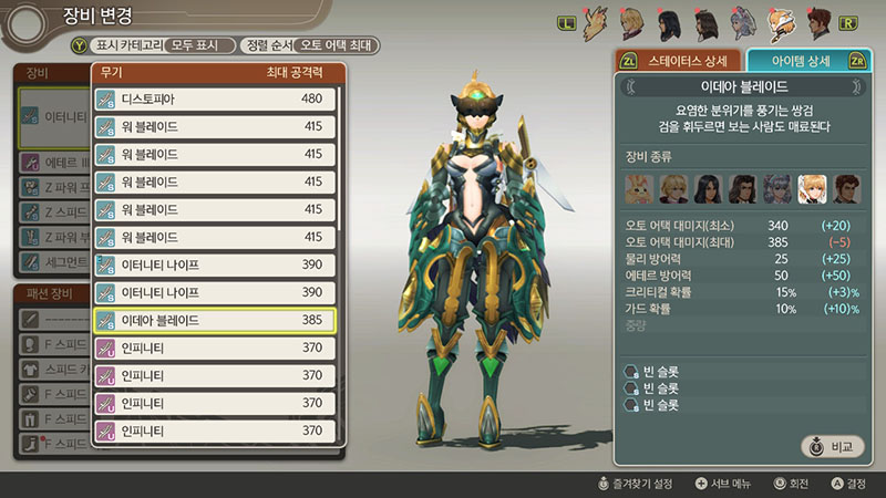 제노블레이드는 무기의 공격력의 최댓값은 무기 공격력 최솟값 +99까지 밖에 계산이 안 된다. 디스토피아의 높은 공격력이 480이더라고 하더라도 실제 높은 공격력은 379로 적용된다. 그러니까 이데아 블레이드가 최강이다.