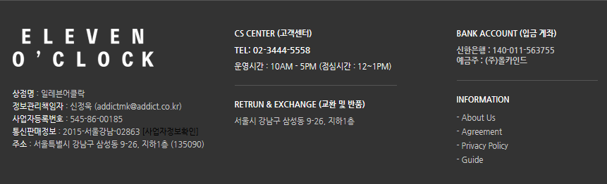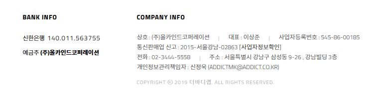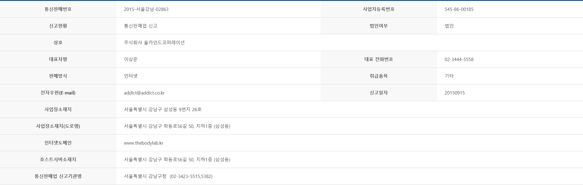 <12월 확인> 사업자 등록번호, 계좌번호, 사이트 주소가 바뀌었으나 회사 주소, 대표자명이 같다. 또한 사업자번호 503~***에 등록된 인터넷도메인이 기존 더바디랩과 일치한다. 개인정보관리책임자의 이름은 바뀌었으나 메일주소는 같으며 문의전화번호는 다른 올카인드 코퍼의 사업자가 사용하는 것과 같다.