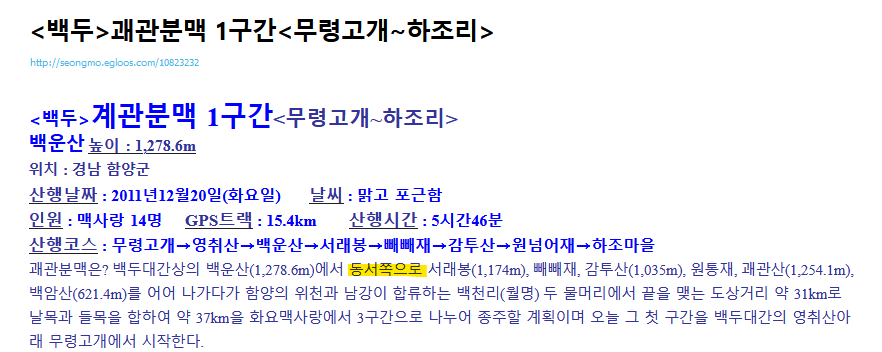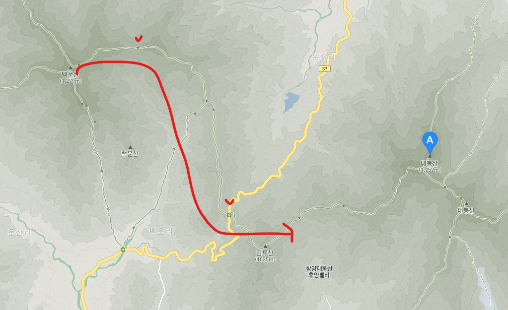 실제 지도로 보면 백운산 (1279m) 정상에서 서래봉(체크표시), 빼빼재(그 다음 체크), 감투산 방향으로..