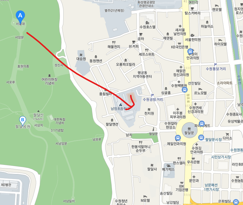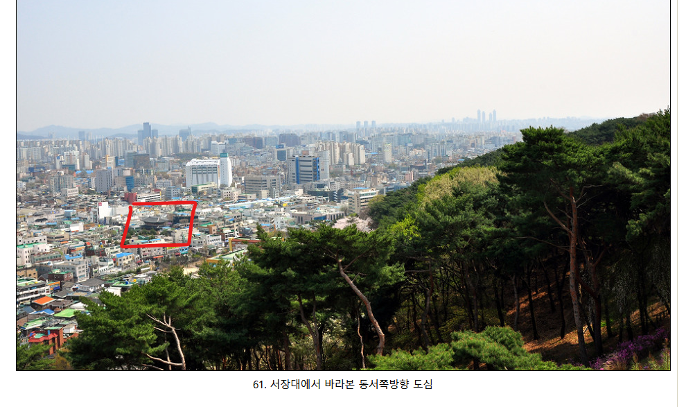 수원시 화성 서장대에서 찍은 사진이다. 표시한 것이 팔달문이다.