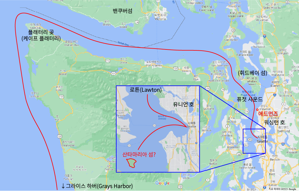 <해변에서>에서 언급되는 시애틀 주변 지역