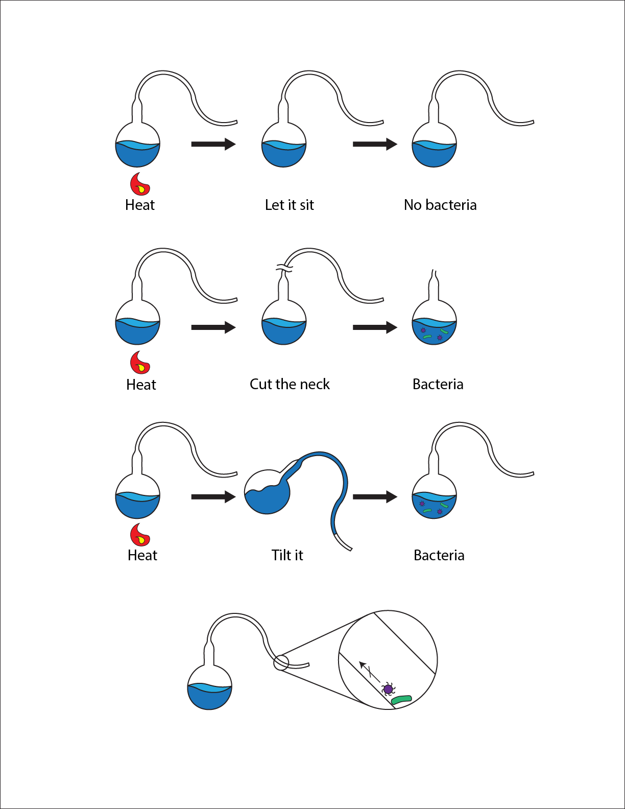 1번 실험에서 박테리아가 내용물과 접촉하지 않는 이유는 박테리아가 높은 유리벽을 거슬러 타고 올라 갈 수 없고, 또 먼지에 묻어서 공기 중을 떠다닌다고 해도 먼지가 좁은 백조목을 공기를 타고 거슬러서 올라갈 수 없기 때문이다.
