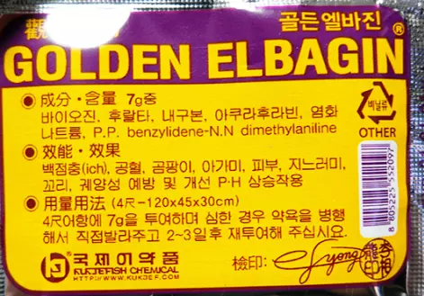 국제프리츠는 골든 엘바진이라는 약 이름만 봐도 알 수 있듯이, 일본 관상어업계의 영향을 받은 회사이므로 일본의 관상어 약에 쓰인 アクリフラビン(아크리플라빈)이라는 성분을 アクアフラビン(아쿠아후라빈)으로 착각하고 기재한 것으로 추측한다. 기원은 그렇다치고, 이 성분의 정확한 이름은 아크리플라빈(acriflavine)이다.