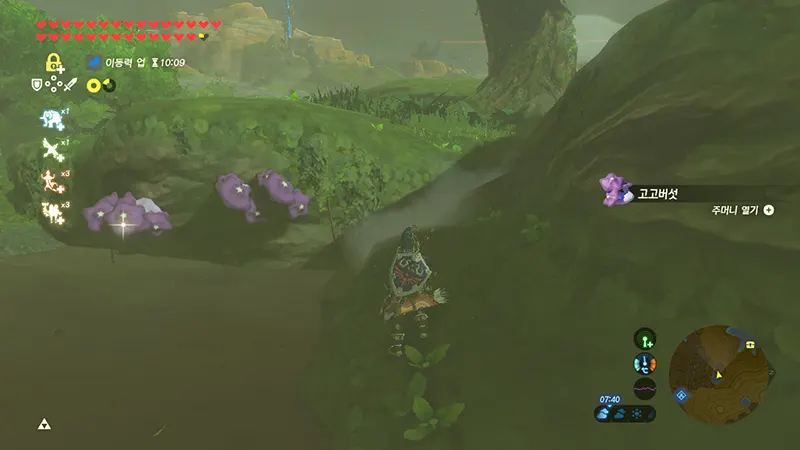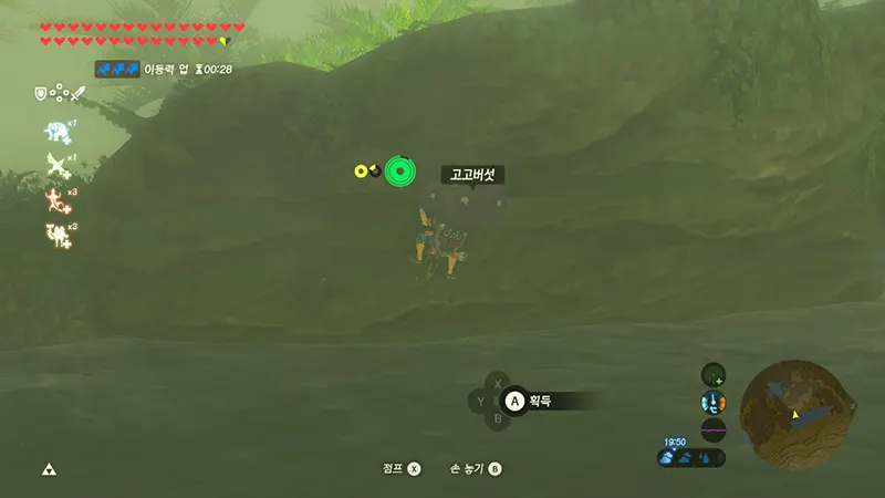 고고버섯은 55(일본어로 5는 '고'이므로 55는 고고이다) 개 모으기와 방어구 강화, 물약으로 100개 넘게 필요한데 보이는 건 절벽에서 한 두개씩..