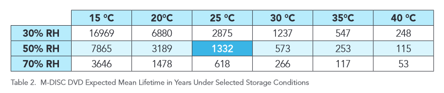M-DISC 개발사의 자체적인 예상 수명 시험 결과는 다음과 같다.
