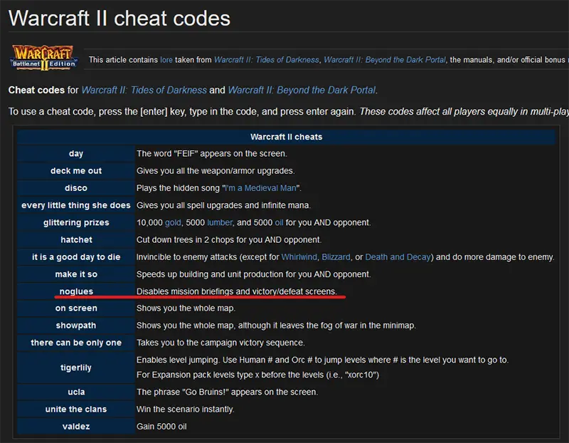 스타크래프트 NOGLUES 치트키효과는 캠페인에서 미션 사이의 미션 제목 화면을 생략하는 것이다.