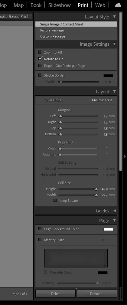 - Page Grid: 가로와 세로의 셀 수를 설정하여 페이지에 여러 이미지를 배열할 수 있다.
