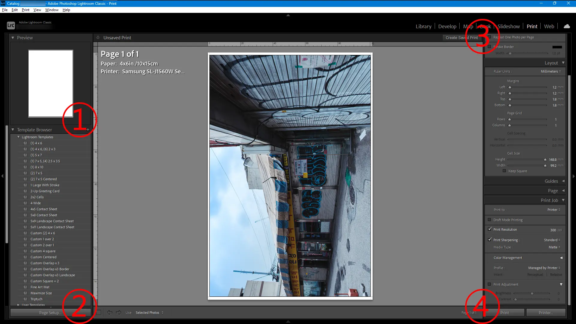 1번은 템플릿을 고르는 곳이다. 그런데 라이트룸에서 기본 제공하는 템플릿은 인쇄 후 재단할 것을 전제로 제작된 템플릿이므로 용지 한 장에 사진 한 장을 가득 인쇄하고 싶다면 쓸모가 없다. 해당이 없다면 2번으로 넘어가자.