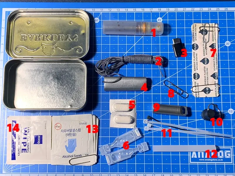 Let’s talk about my everyday carry tin. It’s not an Altoids tin—technically, it’s a Barkleys tin—but the size is nearly identical. Since I live in South Korea, I’ve tailored the contents to suit my environment and daily needs.