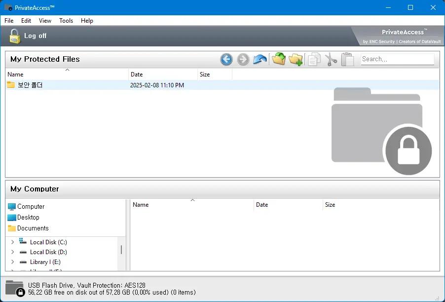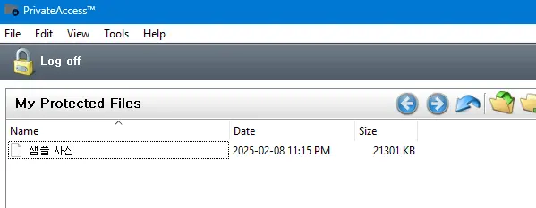 AES128로 보안된다고 한다. AES-128 암호화는 강력한 보안 방식이다. 암호화된 파일은 Windows 탐색기에서 직접 열 수 없으며, 오직 PrivateAccess 프로그램을 통해서만 접근이 가능하다.