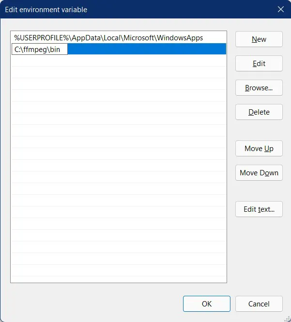 또 다른 새창이 열리는데 New를 선택해서 ffmpeg\bin 폴더의 경로를 추가하면 된다.